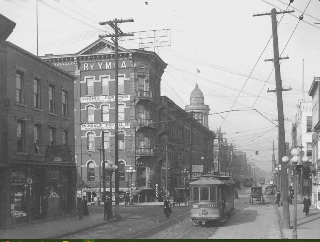 Long before asphalt and strip malls, this corner thrummed with trolley cars beneath the Yukon Building’s Capitol-style dome (added in 1885, removed in 1929).